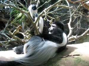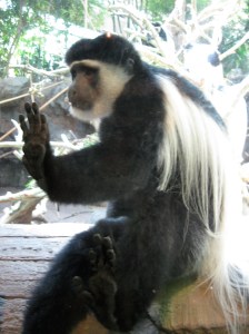 The Colobus Monkey, however, comes across like Garbo – a movie star with an aloof, above-it-all style, and I had not seen one until yesterday. When my wife Nancy and I first approached the exhibit, it appeared a large black cat with an extravagant white tail was sleeping up against the window. But when this “cat” lifted up its head and turned to look at us, we realized that it was definitely not Puff.