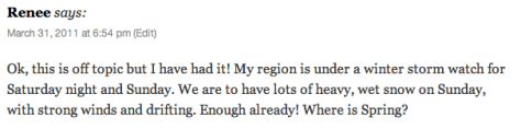 22. Thanks for all the wisdom, people. I’m just back from a spring break with family in MI and FL and IL. You are the best. I’ll maybe think of some wisdom myself. Or I may just go to bed. Good to be home.