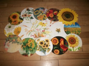 My claim to fame is… (drum roll) … making placemats out of used greeting cards. This started last year when I saw a set of Christmas card placemats at my mom’s senior residence. Cut into 4″ circles, 12 of these are arranged around a large center card and some border, which becomes a contact paper sandwich – clear over the cards, backed with something pretty so it’s reversible. I branched out from Christmas cards, and now do “theme” placemats, like seasons, flowers, etc. It’s so tacky, and appeals to the recycler in me – I always hate to toss those beautiful cards. Save your prettiest ones for me, Babooners.