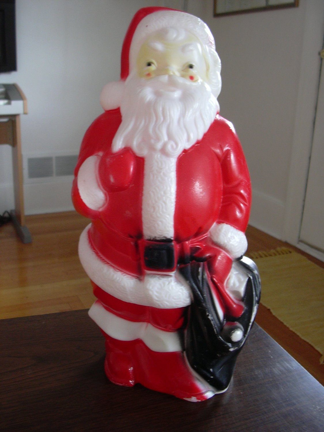 On Thanksgiving weekend with coupon in hand we headed off to the late, great Frank’s Nursery and Crafts. The purchase required a lot of negotiation. My son’s vision was much gaudier and even at half price more expensive than mine. Finally we agreed that a hard-bodied light up Santa with a sack would join our family. We took him home, put him on the front steps of our townhouse, and at dusk ran his cord inside and turned him on. Clearly we were the spirit of commercial Christmas incarnate.
