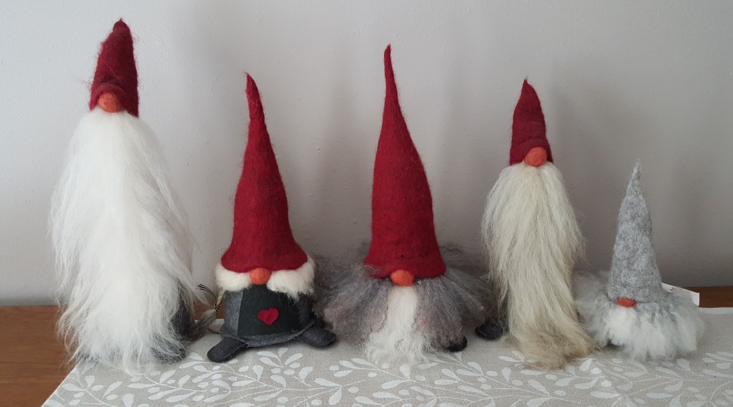 My daughter takes particular exception to the tomte I have purchased-figures in different shapes made out of wool with luxurious beards and red hats. These are made from the wool of sheep raised on the Swedish island of Gotland. I keep them, along with a couple of Yule goats and straw girl, on top of our media cabinet in the living room all year long. Daughter warns me that I am to stow the tomte and goats in a closet the first time she ever brings a beau home to meet the family. I ask “What if he is Norwegian or Swedish?” She says it doesn’t matter, and the weirdness must be hid in favor of good first impressions.