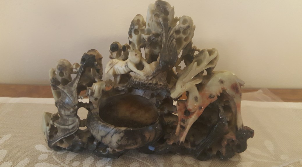 Most were naturally occurring rocks carved and perforated by water, sometimes embellished with carvings, sometimes placed in gardens as points for contemplation or else brought inside. They were chosen on how well they emulated the natural world of landscape, especally mountains and elevations. Ours is 10 inches by 7 inches. It is carved with a stag, a bat, a bear, two ravens, and a honey comb or coral shape. Now that I know this, the shape and design and purpose make sense. I wonder what scholars or deep thinkers might have used this for inspiration.