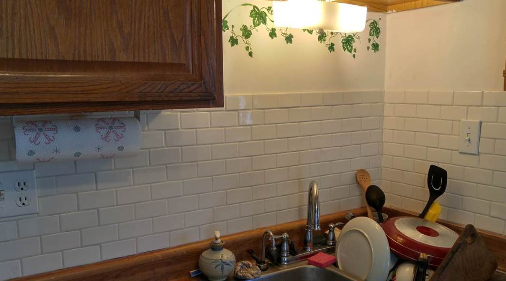 So it didn’t surprise me last summer when she started talking about adding a tiled backsplash in the kitchen. Not wanting to take on a project like that, I resisted. Finally she suggested that SHE would do the backsplash.  I still resisted; as a single mom I’ve heard the “I’ll do everything myself” promise many times.