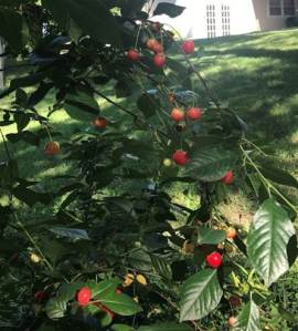 We’ve had a cherry tree just about everywhere we’ve lived and I don’t think we’ve ever harvested enough cherries to make a pie. We don’t even try anymore. The trouble is that the birds love cherries, so that one day the cherries are approaching perfection and the next day they’re gone. We get some pleasure in treating the birds.