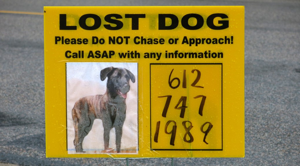 I would likely have forgotten about the sign except that, recently, I saw the same sign in a completely different part of Minneapolis, three or four miles from where I saw the first sign. Usually when a pet is missing, you see a few signs posted on telephone poles around the neighborhood. They’re not generally as elaborate as the two signs I had seen and they don’t usually blanket the city.