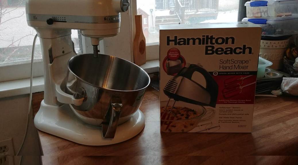 In the meantime, I couldn’t go without a mixer. I’ve never had a handheld mixer so I decided this was a good time.  Did a little bit of online research (very little actually) and ended up getting a Hamilton Beach.  It got me through Pi Day but then mysteriously the next time I used it, it started up as soon as I plugged it in, even though the switch said it was off.  Luckily I was not holding it anywhere near the beaters or I could have lost a finger.