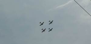 As I was getting ready to go to Richfield, she told me that the boyfriend still wasn’t ready and she wanted to go to the parade with me. Woo hoo! Two stadium chairs, ice water, phones and umbrellas (which protected us from the sun and eventually the rain) and we were on our way. It was a fine parade, with some planes flying in formation (a first) over the parade route three times and a giant grocery cart (also a first). About 75% of the parade had gone by when the rain started and YA said she still wanted to stay until the end. So we sat in our orange stadium chairs under our umbrellas and continued to wave our little flags at the remaining paraders.