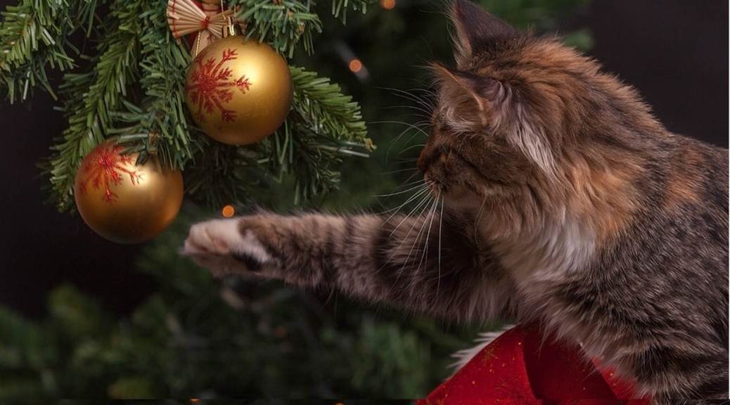 For the last two years we have put chicken wire around the trunk of the tree to keep the cat from climbing. Ornaments at the bottom (roughly waist high and down) have been securly attached and are unbreakable. She ignores the lights – thank heavens – but she does manage to get a few ornmaments off the tree to bat around. This year we also have new doggies and no idea what they will do with the tree, though it’s a reasonable bet that if the cat gets something off the tree Potato (the younger pooch who I caught chewing, I kid you not, a nail a couple days ago) will chew on it like a dog toy. And then Sugar will want in on that fun…I may have a tree that is only decorated on the top parts this year.