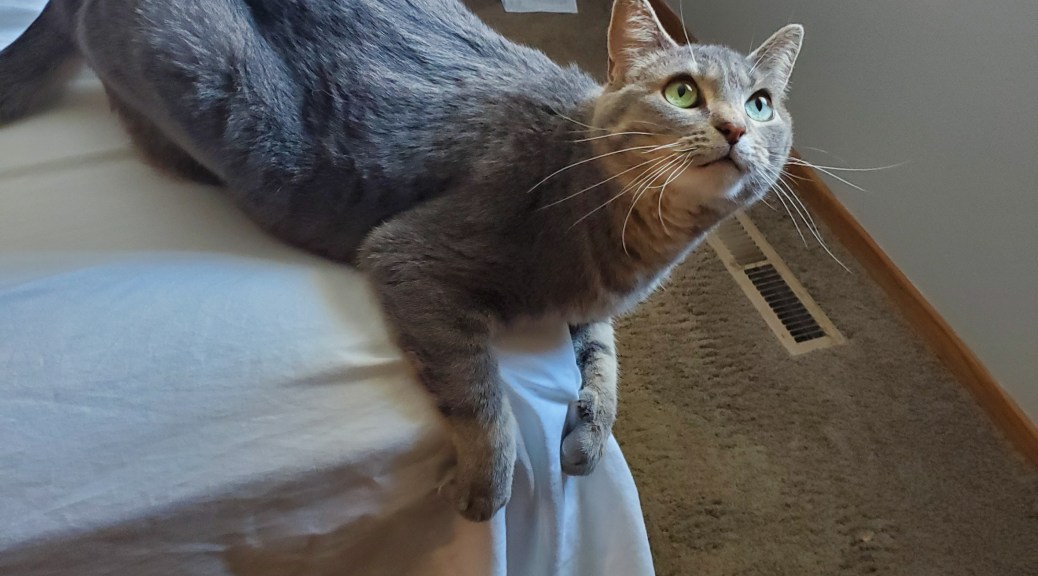 Luna, our grey cat, gets very excited whenever I change the sheets. She leaps onto the mattress and starts clawing at one of the corners, as you can see in the header photo, and then jumps on the sheets and blankets as I try to flatten and adjust them. You can see the excitement in her face in the photo. Sometimes she lets me cover her completely with the sheets and blankets, leaving a distinct, cat-shaped bump in the newly made bed. She also helps Husband as he packs and unpacks his Rez suitcase, rubbing all his clothes and sitting in his suitcase. She is such a help!