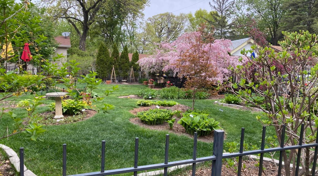 I think I’ve mentioned that there are a couple of gardens in my neighborhood that I adore.  In fact, on my daily walk with Guinevere, I try to walk by both houses before heading home.  I am insanely jealous of both these gardens, wishing I had the foresight and talent to have a garden like either of these.  As you know, my garden is just a mish-mosh of what I like and what survives in Minnesota, planted in dribs and drabs over the years.  A lot of hostas, lilies, sedum, irises.  The only overall plan is the “more flowers, less grass” plan – that’s it.  No maps, no sketches, no layouts.