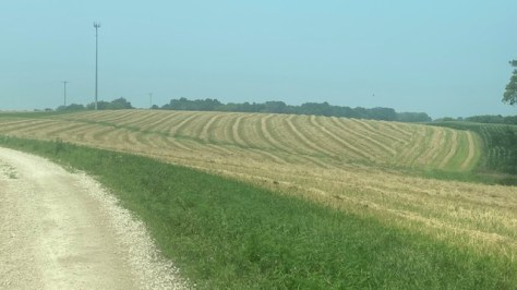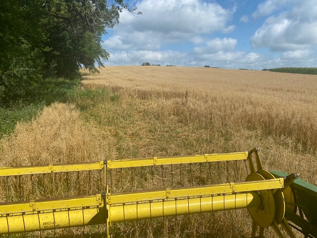 When cutting, it’s best to make about 4 or 5 rounds all around the field, so there’s room on the ends for the combine to turn around, (and that goes for any crop; corn or beans or anything); we call those the ‘headlands’. And then it can just be cut going back and forth. Corners are tough so we avoid those when we can. Tough in that the machinery doesn’t make 90 degree corners very well, it doesn’t plant well in corners, hard to stay on the row in a corners.