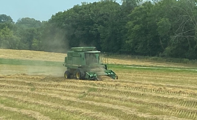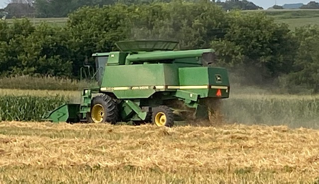 OK, so now it’s Saturday and the combine is here and harvesting and I don’t have any trucks yet. I can’t get the truck guy on the phone. I call another guy from the farm, but he’s over in Wisconsin and he can’t get anyone on the phone either. Finally, we just go to the farm and get a semi and drive it back here ourselves. And, of course, there’s a summer shower and the harvesting is done for the day. Next day he’s back and finishes that field. And a few days later gets the last of it.