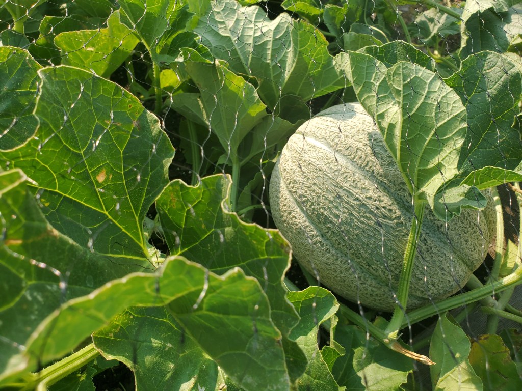 Nothing else was missing or damaged. I covered the cantaloupe bed with bird netting and stapled it onto the wooden bed so that it would be more difficult to abscond with the remaining melons. Then, we started to hypothesize.