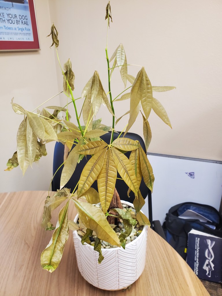 I just arrived at work to find that our dear Hispanic cleaning lady took all the leaves off the plant and slid it as close to the window as she could get it. I take this as an omen she knows what she is doing, and we just have to wait for new leaves to form from the green stems. I fel I should put a sign up that this is NOT my plant, and I didn’t mistreat it.