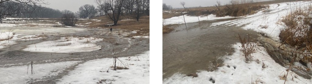 The culvert is mostly frozen yet, so it didn’t take too much more to overload it. But since the ground was frozen it didn’t hurt anything. Later in the day the runoff slowed and it was back in place.  When I was a kid there wasn’t a road here, we had to go off through the pastures to get to those fields. And my siblings talk about skating on the pond down there. I think I even caught a crawdad down there once. Then dad put in some old culverts and made the road, and when that washed out, I had a better culvert put in.
