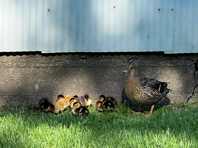 We have ducklings! Mama (one of the mama’s. It seems to be a community nest) was out in the yard with 9 ducklings this morning. Kelly had a good idea to just put her in the pen with the chicks.