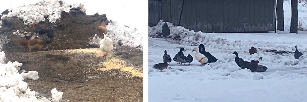 I’ve been able to do more chores again. Feeding the chickens and ducks and collecting eggs. One day there was 7 male pheasants came from the East, while the 5 females come from the North to eat the corn we throw out.