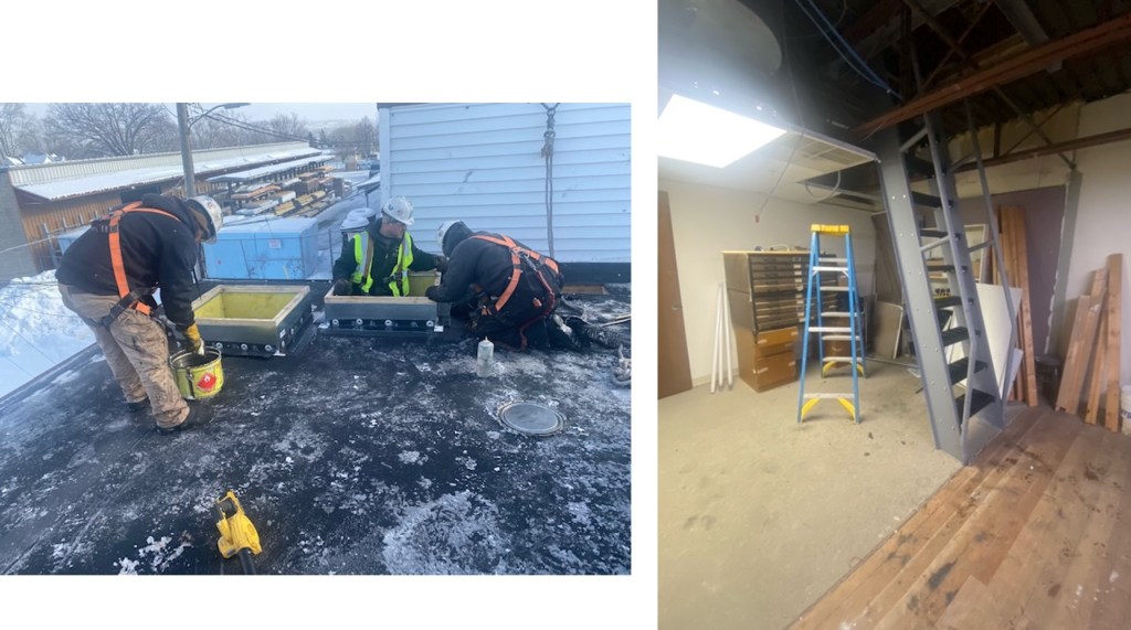 I’ve mentioned a few times in the past about remodeling at a local theater and now some HVAC work. The HVAC work was begun in August, new ductwork was installed, and some old things removed, hopefully the rooftop unit will arrive in March. This past week, they installed a ships ladder, and cut a hole in the roof so we have roof access from inside rather than an extension ladder outside the building. It’s really fun; I’ve been on the roof several times this week. Also, couple of supports and steel beams were placed on the roof to support the rooftop unit whenever it gets here. I had a good time talking with both the sheet-metal workers and the ironworkers. The first day, I wanted to get up on the roof to see what was going on, but I didn’t think I should be climbing the outside extension ladder quite yet. It took me a few, tries to find the person that owned and operated the boom lift, and I played the “new knee card“and he took me on the roof.