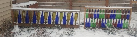 The town was platted out sometime in the 1960s, and included alleys in the middle of blocks.  One by one, the city “vacated” many of those alleys, but some remain.  Near our house there’s one that a community association “neatened up” within the last 10 years. It’s an “art alley”.  One back yard installation included a few racks of colored bottles on poles. They attracted me. I figured I could do that, myself, in my own yard.