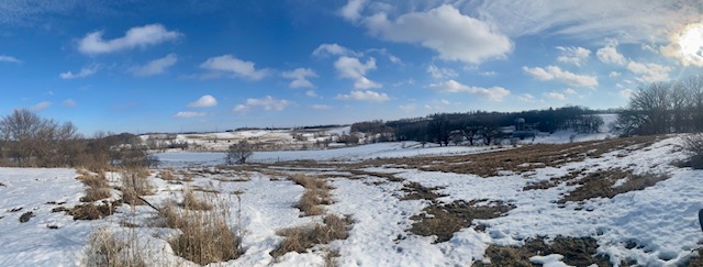 I took the header photo last week before the snow. Daughter, dogs, and I took a ride in the gator and stopped for this photo. The dogs run halfway, then we load them in the back, and they ride the rest of the way home. Humphrey is not a jumper; I need to find a snow drift or bank so he can get in there.