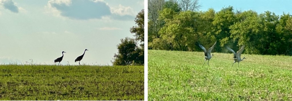 I did plant some rye on Monday and more on Thursday evening. The rain predicted for Friday morning isn’t going to a mounted to much. We wait and see. I spotted a couple sandhill cranes while out planting on both days. They must like this field. It was interesting: On Monday I had gone around the field once, turned around at the end of the field and was coming back when I saw them in the middle of the field. Were they there on the first round? I was maybe 150’ from them and they didn’t pay me too much attention. But then as I came around the corner and got closer, they flew off. Sorry kids, you didn’t get much of a rest here. Thursday was the same thing; didn’t see them on the first pass and then there they were. I adjusted how I planted that field so they could hang out longer. When the time came and I had to go their way, they had flown off.