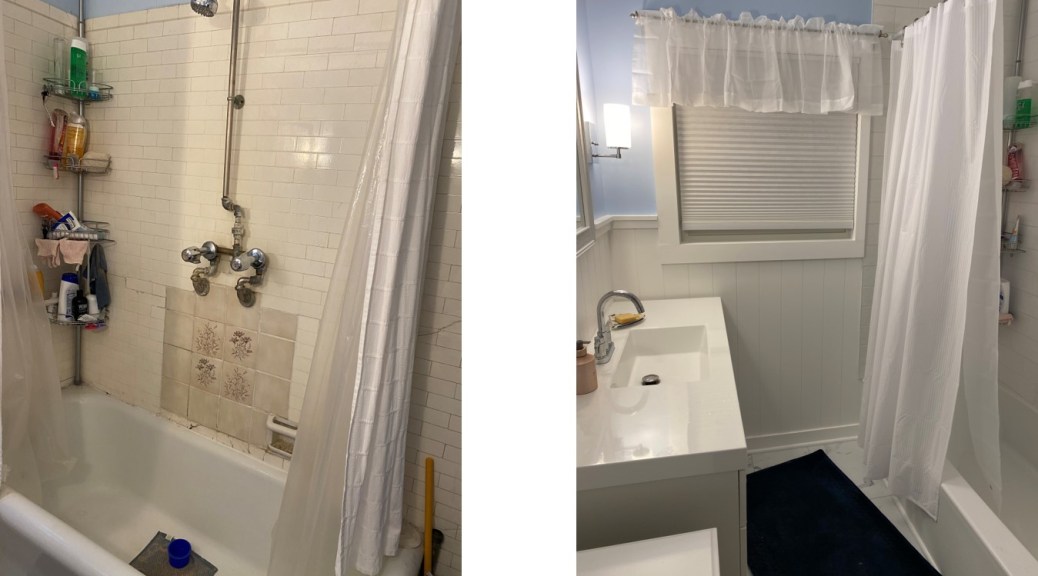 Second… also do everything in your power to have a handy person living in your house with you – especially someone who is invested in the outcome of your project.  I have YA for this.  She is MUCH handier than I am, as she is more patient as she goes about whatever she is working on.  She installed the toilet paper holder and the towel racks.  She un-installed the new light sconces because she thought there was a “ridge” along the edge, spackled and sanded and then re-painted.  She also installed two slider baskets on the bottom shelves of the vanity so it would be easy to get at our stuff.  And she also took a teeny paintbrush from my studio to “straighten” a couple of the paint seams.