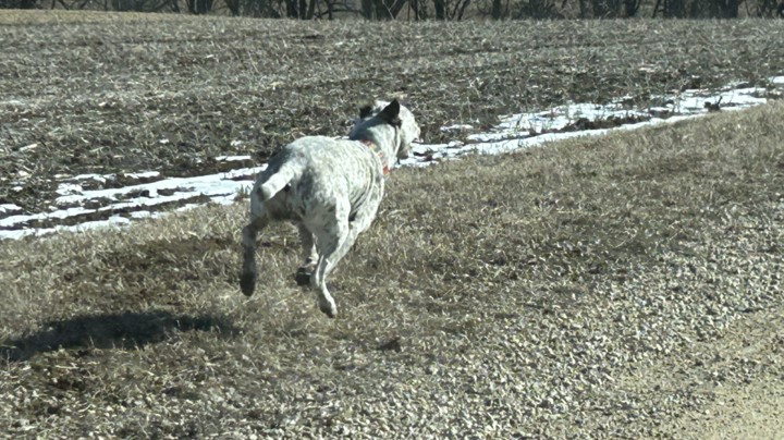 Luna is fabulous. She wasn’t as big as I was expecting – she’s right between Humphrey and Bailey in size, so they have a great look when they are standing together. We took a ride up the road on the gator. The dogs all rode in back until we got up to the fork; they all got out and walked a bit. Then Humphrey and Bailey got back in and Ben gave Luna the signal to go. And go she did. The photo above doesn’t really do justice to her run but at one point we were going 27 miles per hour on the gator and she was keeping just ahead of us. If you look closely you can see that none of her feet are actually touching the ground. Amazing!