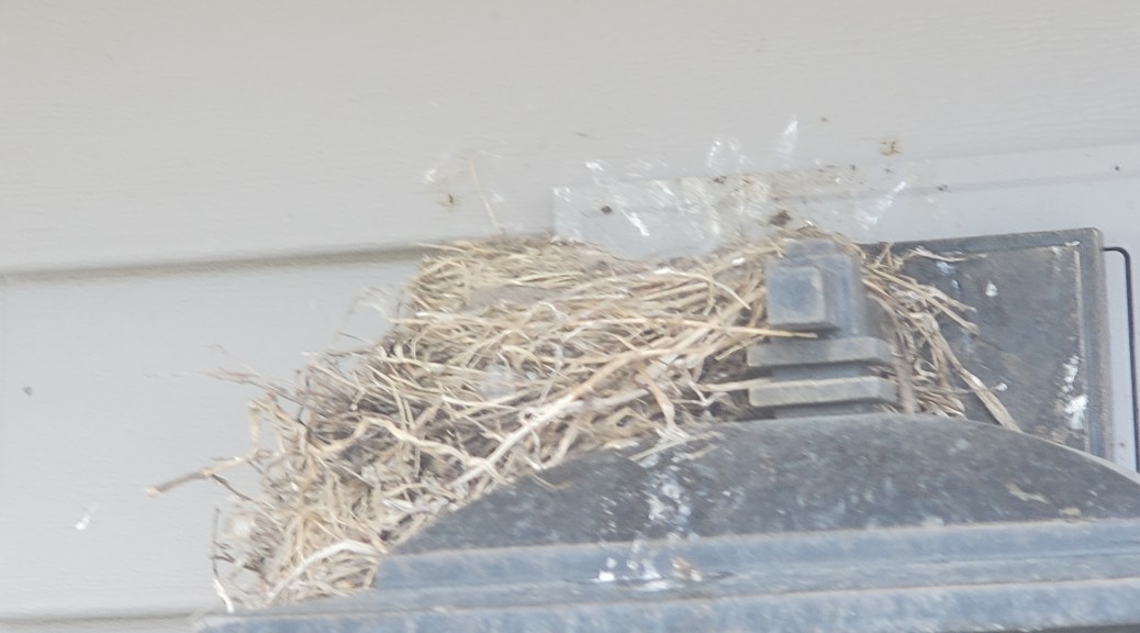 For the past several weeks Husband and I didn’t go out of our front door. Some enterprising robins built a nest atop the light that illuminated the stoep, hatched four eggs, and were busily feeding their chicks. We didn’t want to disturb them by going in and out the front door. You can see the nest in the header photo.