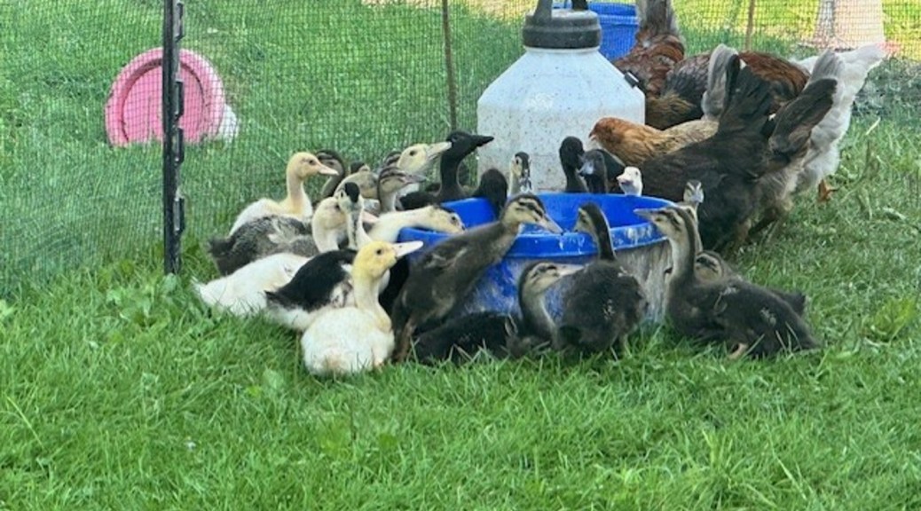 The weather is changing. The rain has stopped and the temps and humidity are up. I’ve turned on the chickens fan, and got the ducks in their outside pen. The ducks are at that awkward stage where a gallon of water last them half a day, everything‘s wet, and they chewed off the string on the bottom of a brand new sack of feed so then I had an open tube that used to have 50 pounds of feed in it. It was time to get them outside.