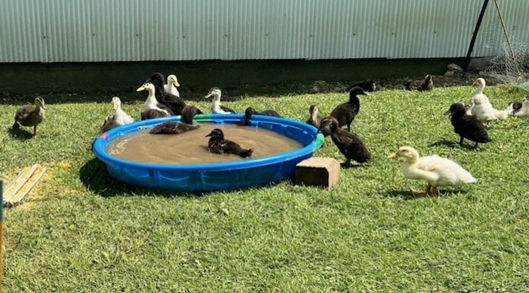 When refilling the water and pool (by the way, fresh water lasts about an hour before it looks like mud again) I sprinkle the ducks. They love it. I even set up the sprinkler for them sometimes.