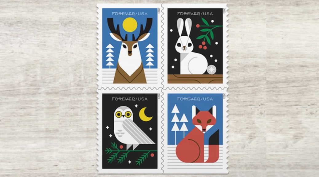 I looked at the bulletin board that had the available stamps displayed. There was a design I liked, with a deer, a rabbit, a fox, and an owl in winter settings. Appropriate for Christmas or Solstice, or whatever.