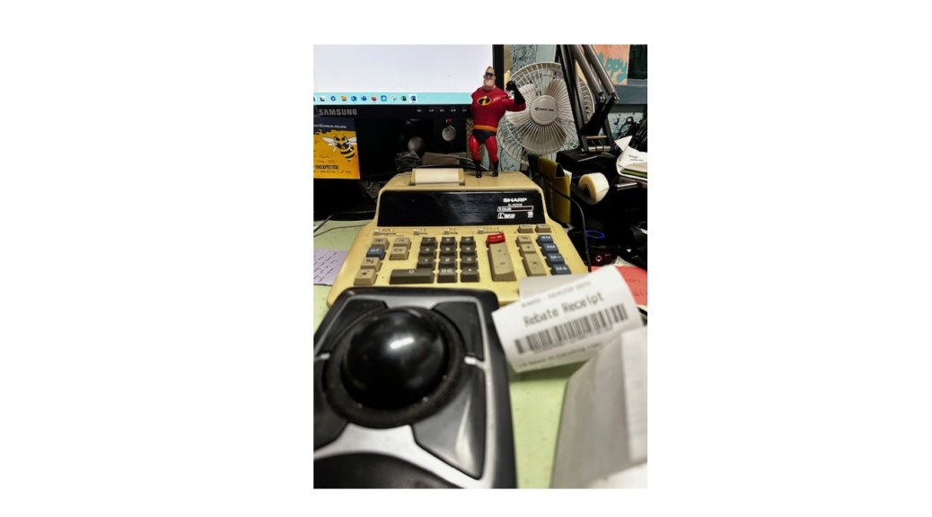 Pens, pencils, and rubber bands. Also an array of post-it notes of various designs and sizes live in my junk drawer. I must say that Bill’s question, “which junk drawer” is appropriate. I have several. There is the household tools junk drawer (tools, batteries, and the Costco receipt envelope, not to mention flashlights that do not operate at all). Then there is the communication drawer with the pens and rubber bands. There is an old style calculator there, too.