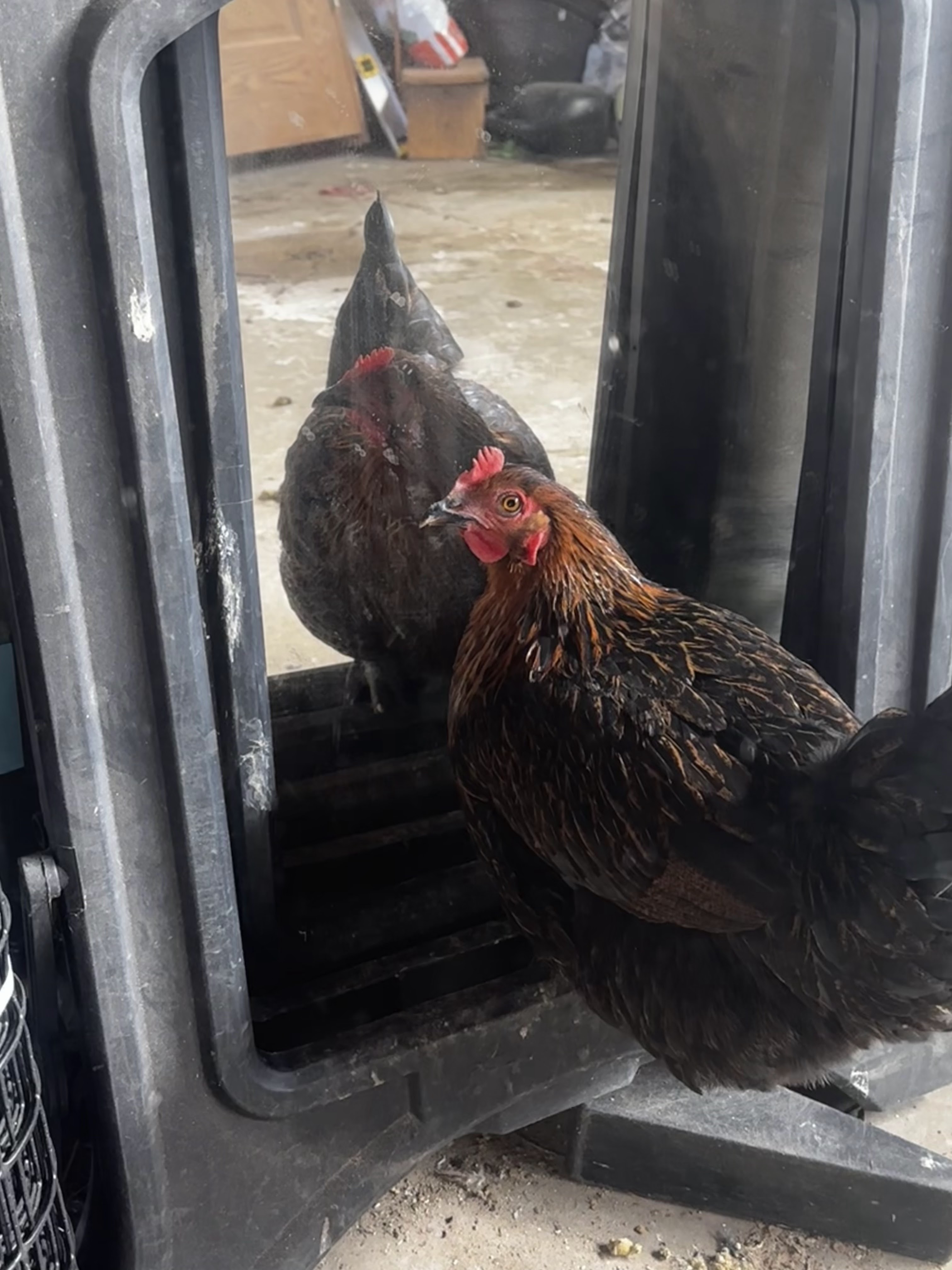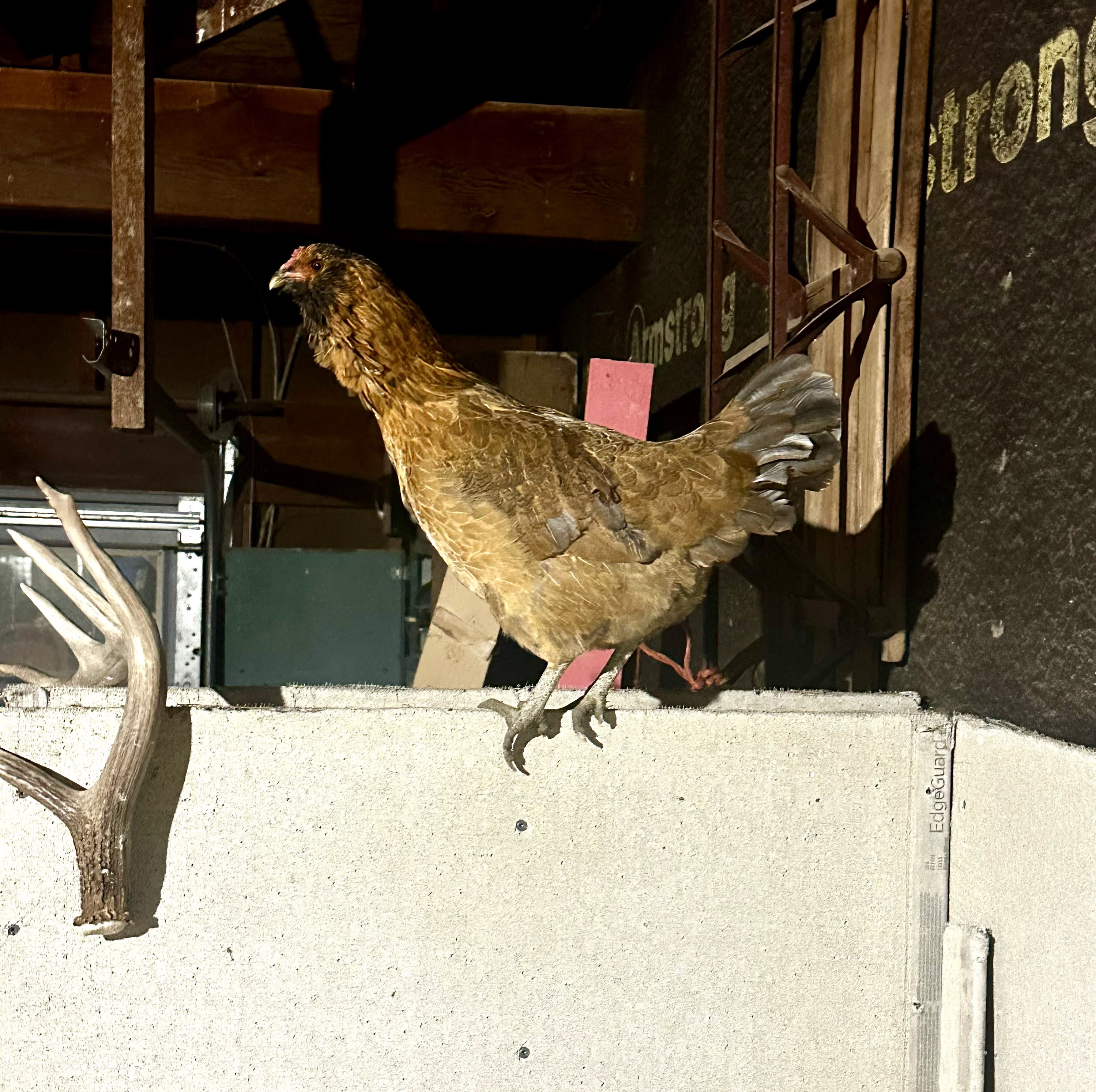 We’ve had this one chicken living in the garage all winter. During the day she has taken to perching on the bottom rung of a sawhorse and looking at herself in a mirror.