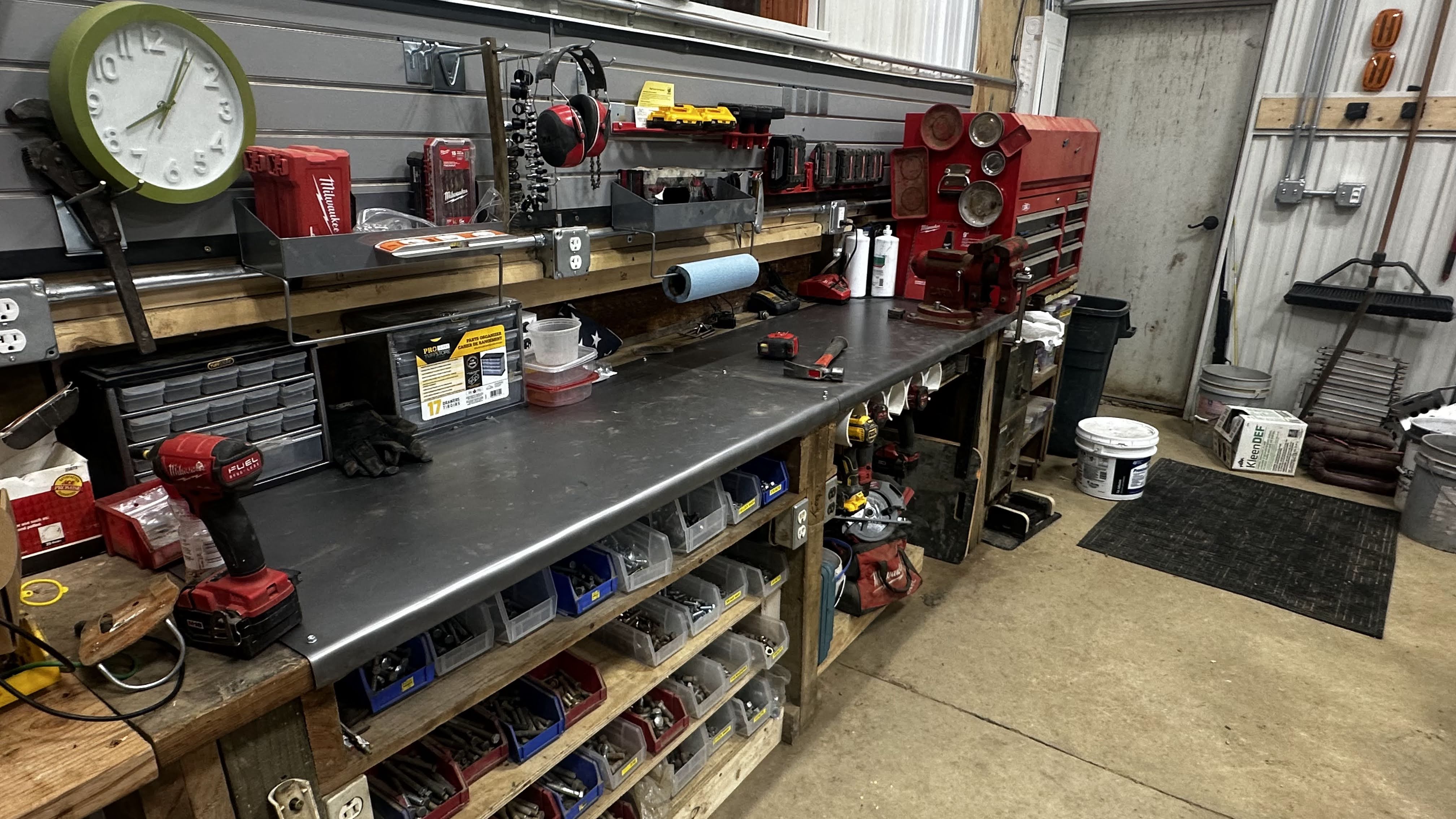 Out in the shop, I added a metal top to the work bench. Dad built this work bench after the shed was built, so maybe in 1982 or 1983. When I started on the shop project two years ago, the guy doing the insulation wanted me to pull the bench off to redo the insulation behind it. I said no. Dad had put styrofoam and fiberglass insulation on that wall before he added the bench. I tore the top four feet off the wall as part of the shop project. The old insulation was pretty bad. Yeah, I probably should have redone the bottom four feet too, but I was already in over my head on this project and didn’t think I could handle any more. Hindsight you know. The bench is pretty well built, and the top is 2×8 boards with a gap between them. Stuff is always falling into that gap. Maybe it was Dad’s way of cleaning off the bench, to sweep the dirt and dust into the gap. Which then ended up in the bolt storage he had underneath. A couple weeks ago, I lost a screw down that gap and I decided that was it! I am covering this! I bought two sheets of 16 gauge steel (about 1/16th inch thick) 2′ x 4′ from a big box store. ($70 each! Jeepers!) Thanks Obama! (That’s a joke you know) And I rounded over the front edge. I need to get some different screws to hold it all in place, but it looks real professional. I’m glad I did that.