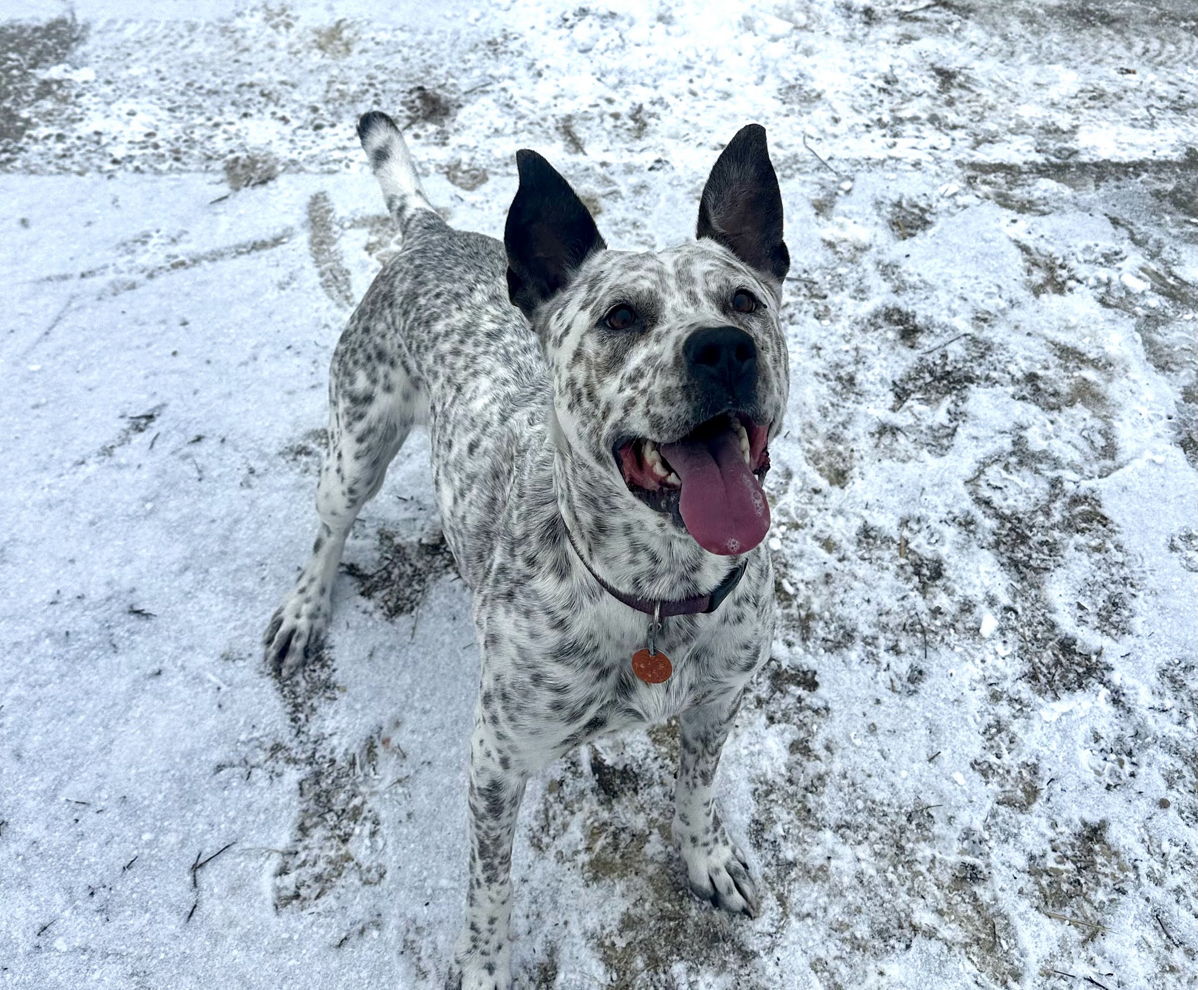 And if I’m getting ready to go outside, she’s watching, soon as I put on my hat, her excitement is ramping up. And I reach for my coat and she just can’t help herself. I know I should probably work on her training but she’s just so dang excited! Bouncing on her back legs and jumping up and down and bouncing off the walls. She just can’t wait! And it’s hard to contain that much enthusiasm! Once outside, and I have the ‘chuckit’ ball and stick and she is just full run getting the ball back. Unless she misses the throw. I’ve never seen a dog so bad at finding the ball. It’s a bright orange ball. In the white snow. She’ll walk right by it. She’s sniffing for it. Takes her a while to find it again.