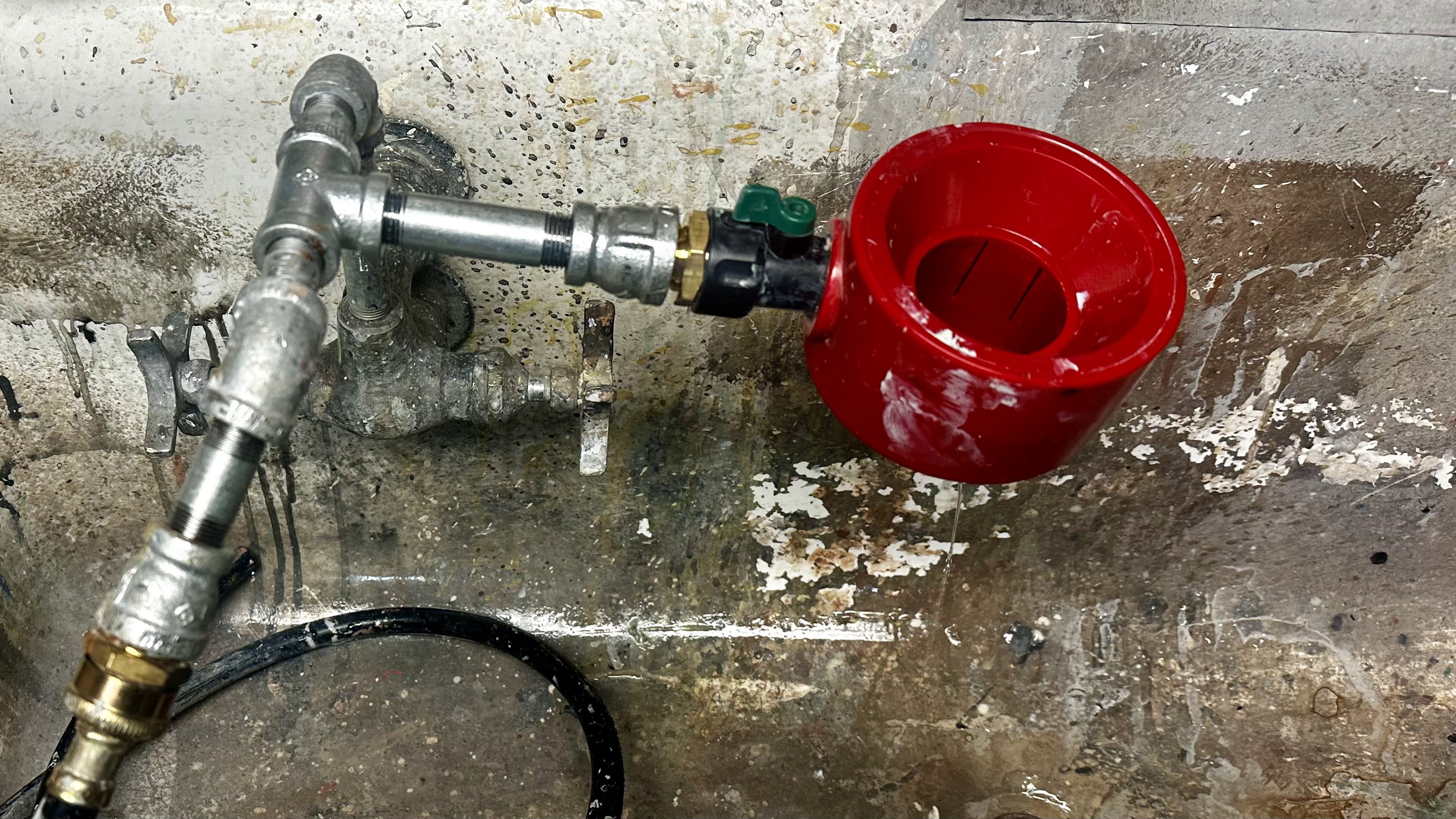 And after we talked about plumbing the other day, wouldn’t you know I was doing some plumbing at another theater. It’s an old sink with two faucets. One faucet is for washing paint brushes, the other one I have a hose on it for filling the mop bucket. Then I added a gizmo for washing out paint rollers. I have one at the college and I love it! It need some modifications here.