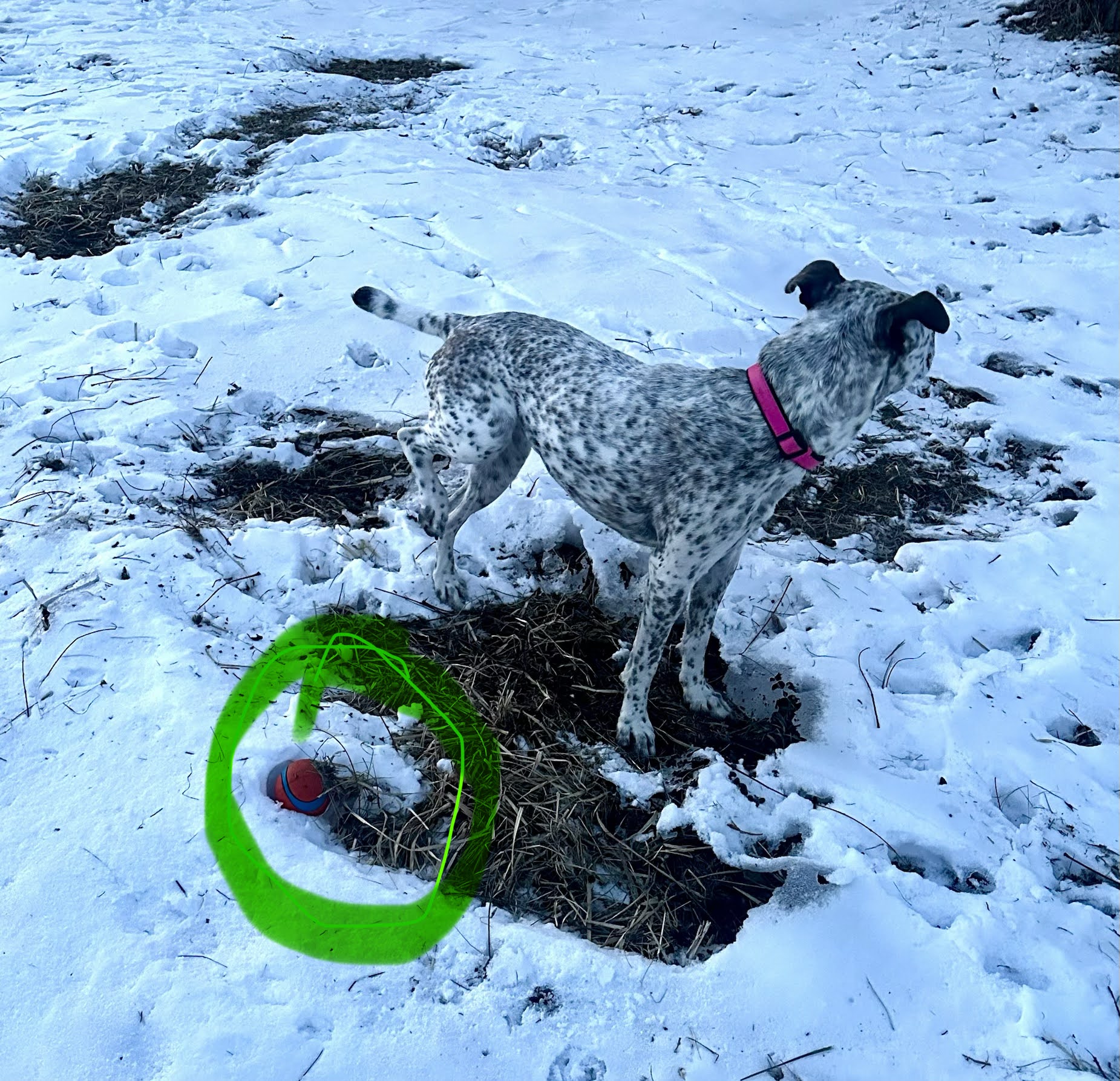 And after the first couple throws, she doesn’t like going over towards the machine shed to get it, because there’s a little ice over there. And I don’t blame her for that. Thursday morning after a few throws, the ball went over there. She trotted over there a bit, slowed down, and came back, like ‘What else you got?’. Thursday afternoon we went and got the ball. She grabbed it, and took off across the field to follow Bailey sniffing out some deer tracks. She left the ball lay in the snow again. I get more exercise going after the balls than I get from throwing them.