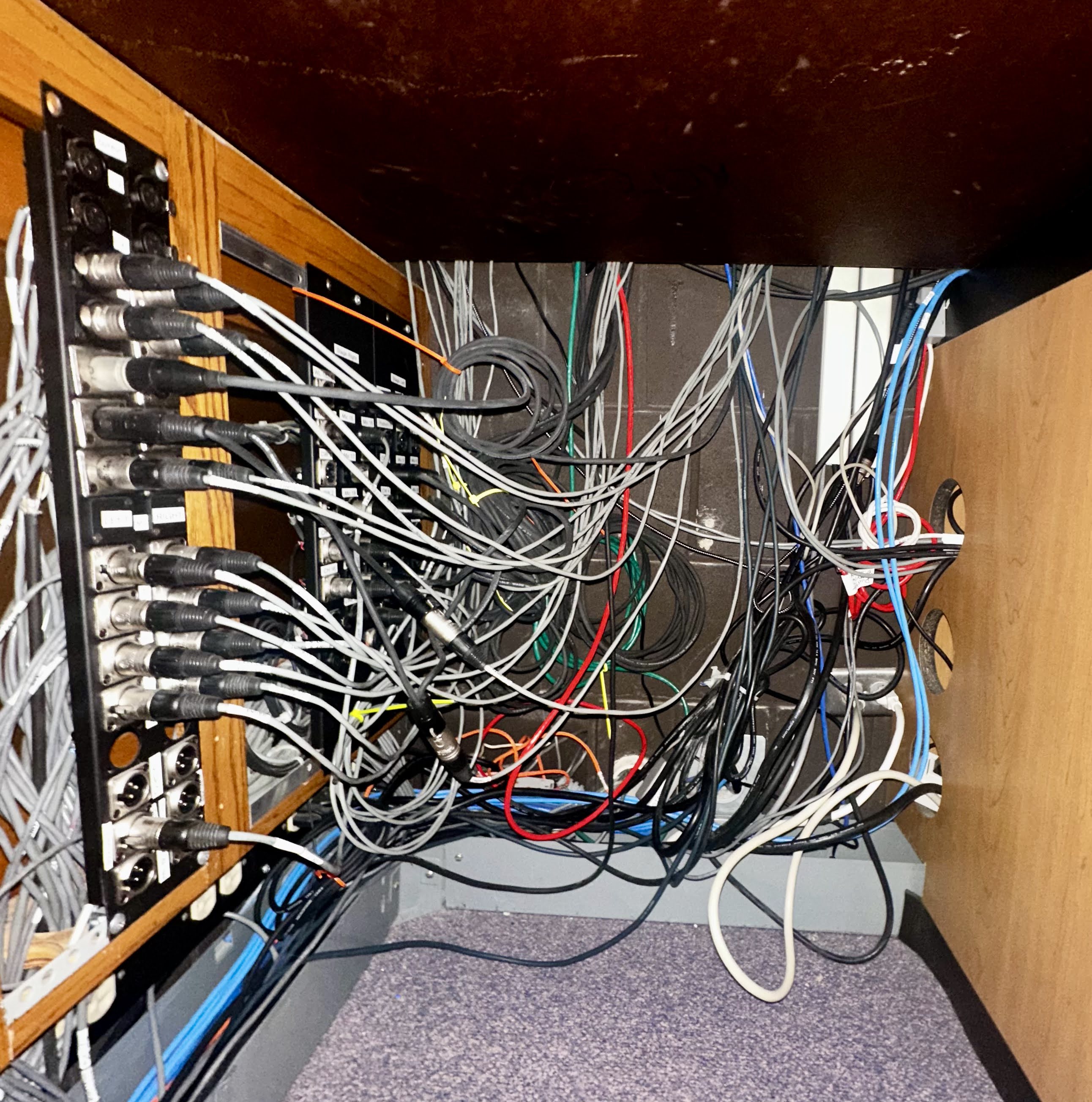 At the college we got a new computer in the sound booth. Trying to hook that up and all the connections have changed. And the jumble of wires under the sound board finally got too me. Over the years, things have been changed, and new wires added and no one ever pulled out the old. I asked one of the managers come offer advice. Are we ever going to back to this video connection that is old and outdated? Do I Have your permission to cut it off? Yes. Cut it off, no, we’re not going back. But some of the wires go through the wall and up into the catwalk where the projector is. They said just cut them off close to the wall and this summer, that crew will pull up what they can.