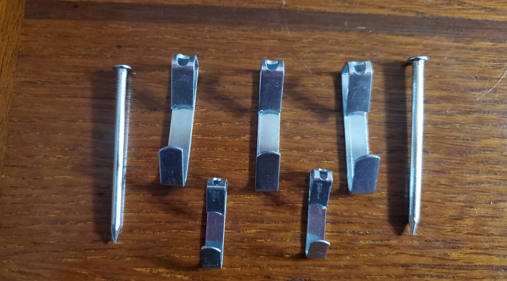 For some reason I make Husband anxious by my picture hanging method, which involves careful measuring and centering. He worries that the pictures will fall off the walls because the nails and/or fasteners will rip out of the drywall, and wondered why we didn’t secure them in the wall studs. I explained that the hangers pictured in the header photo are very secure and that none of our pictures is so heavy as to require securing in a stud. I think he believes me, but still is anxious about the whole process.