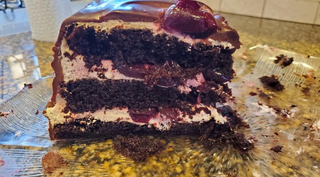 Son and I agreed that we wanted a German/Central European cake to celebrate, and he found a lovely recipe for Schwartzvald Kirschtorte. It was a fairly easy recipe for an experienced baker, and I baked the three cake layers on Friday. Grandson and I assembled the cake on Saturday afternoon after I had made the massive amounts of sweetened whipped cream, excessive chocolate ganache, chopped dark, sweet cherries, and kirsch syrup that completed it. Grandson loves to bake and cook. He really loved licking the spoons. It was a 9 inch cake that served 12 people. The header photo is all that is left after we all had second and third helpings on Sunday. It was a decadent cake..