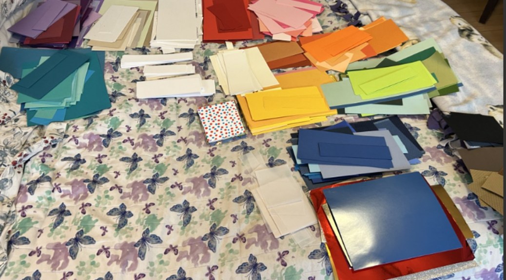 You’d think that with stacks of paper, I wouldn’t be so stingy with it. I keep almost every scrap, unless it’s thinner than 1/2”. There are two plastic bins in my studio with paper scraps – one is for solid-colored cardstock and the other is for patterned paper. Both these bins are full and I spend a bit of time sifting through to see if there is something I can use rather than cut into a new piece of stock/paper. I try to keep it organized, but many days when I’m straightening up after I’ve crafted, I just toss the scraps into the bin willy nilly.
