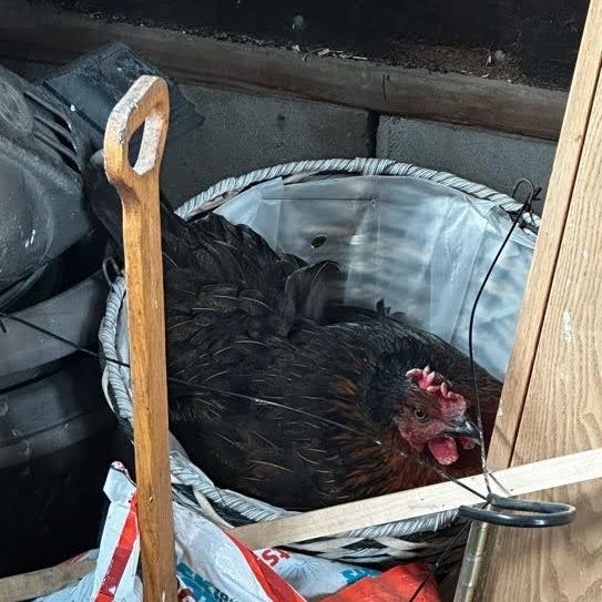 And this second chicken that’s moved into the garage and is nesting in this basket…