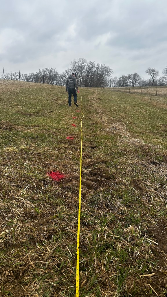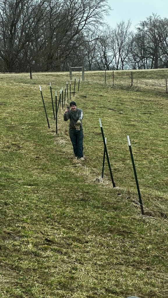 I bought Padawan and me new shovels. Friday I picked up 100 seedlings. Next week I’ll pick up another 75. We are planting gray dogwood and Ninebark to create a natural wind break rather than the snow fence. Kelly is excited not to have to do snow anymore but there’s a lot of work that has to go into this before we get to that point. Using a string and a 100-foot tape measure and downward marking spray paint, we painted a dot every 6 feet apart in two rows 8 feet apart. Thankfully, the heavy rains did not wash off the dots. I also bought 500’ of plastic fencing and garden staples, and we’ll try to protect these tiny plants.