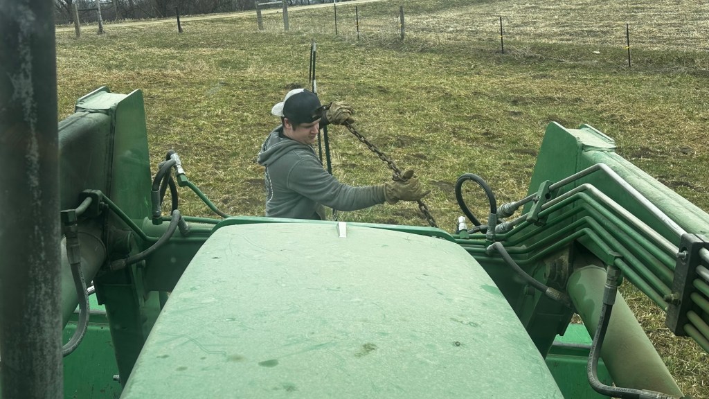 Last Friday Kelly took down the snow fence. On Saturday Padawan and I pulled out all the fence posts. I didn’t count, but 75 or 80 posts. There are various methods to removing old metal “T” fence posts: You can wiggle them back-and-forth side to side and front to back enough to make it loose and pull it out by hand. Sometimes you pull it out a couple inches, then wiggle it some more. Typically they’re in the ground about fourteen inches. The stubborn ones, we wrap a chain around it, hook the other end onto the tractor loader, and lift to pull it out. Some people use jacks or other means of mechanical leverage, it just depends. I had gotten maybe 30 loose by hand. Padawan got a good system going of wrapping the chain, pulling it taught, and I’d lift it out. He said he liked the work. I think he’s starting to see the feeling of accomplishment.