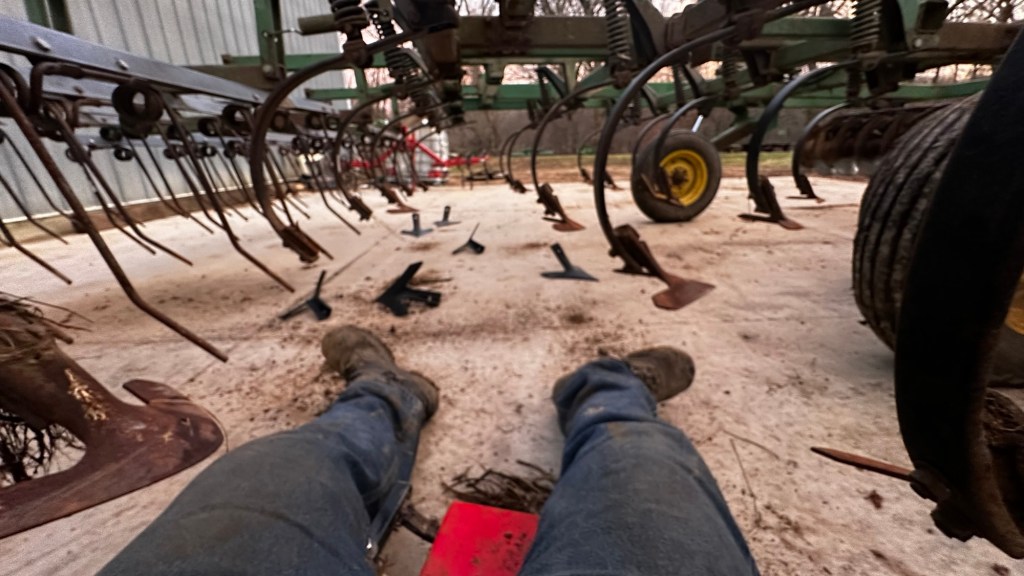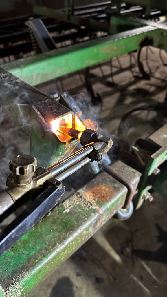 At the farm, one recent day, I replaced shovel points on the digger, replaced a broken bolt, and found a broken bracket that supports the coil tines at the rear. Still haven’t gotten the bracket off. Started with a hammer, got a bigger hammer, got a torch, and a grinder. Back to the torch and grinder again the next day. Ordered new parts, went to John Deere and got them on Thursday. They’re still sitting in the shop. Between planting tree’s maybe I’ll work on that.