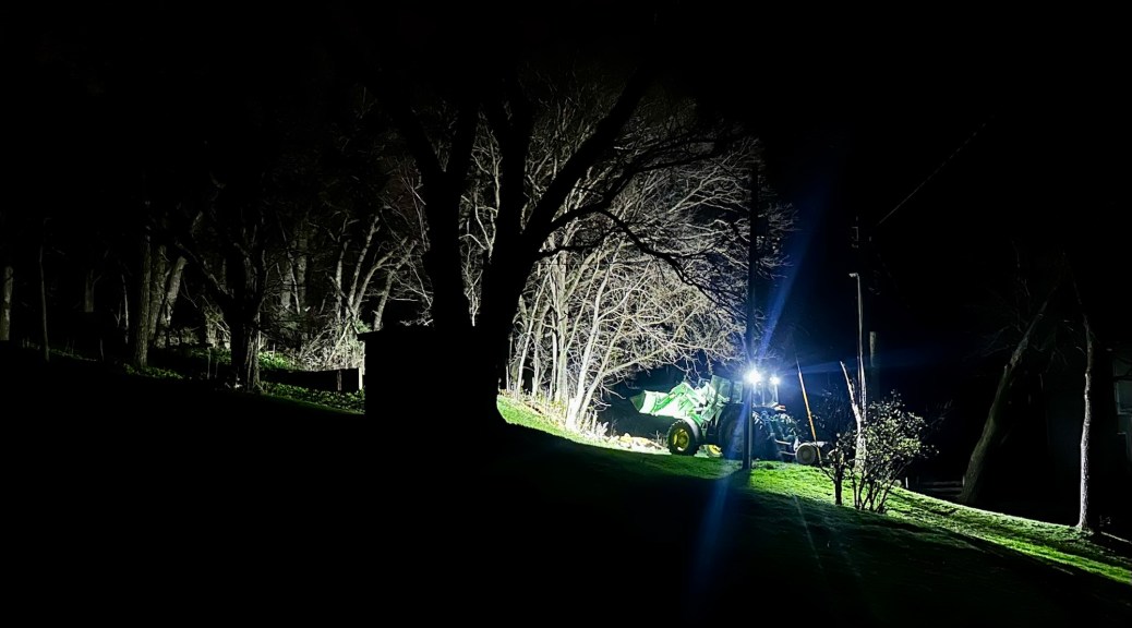 A late Friday update: Padawan and I planted 50 tree’s before we got rained out Friday afternoon. It went well. We had a good rhythm going. The tornado sirens were going off and we just kept working. It all looked fine out there. There was some small hail. We took the dogs and the gator and went up to the highest point on the road and everything looked fine. Then my neighbor texted and asked if we were OK and said, “I saw the trees!”. Uh… what trees?? Oh, you mean the 6 tree’s across the township road? And a few evergreens that tipped over across the road. Power was out, power poles leaning, broken, a couple sheds blown over. Just a narrow swath in our area, maybe some straight line winds. Once again, Thankful for our sheltered little valley. We had several people helping cut up and clean up and a few neighbors stop to check if we needed help.