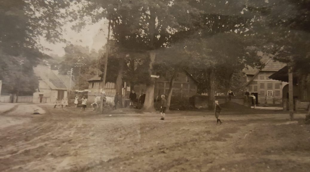 I have an old photograph of a German village street from the early 1900’s. I was given the photograph by my maternal grandmother, who wrote on the back “The only street in Grandpa’s birthplace which is on Dead End under trees”. The Grandpa she refers to is her husband, my Grandfather Ernst Bartels. I wonder where she got her information, as she never stepped foot in the place. I can hear her saying the words about the village with some derision in her voice. She was a city girl from Hamburg who met my grandfather after she immigrated to the US. She found him impossibly rustic and dull. She always felt somewhat superior to him and his family. She spoke formal German; the Bartels all spoke Plattdeutsch.