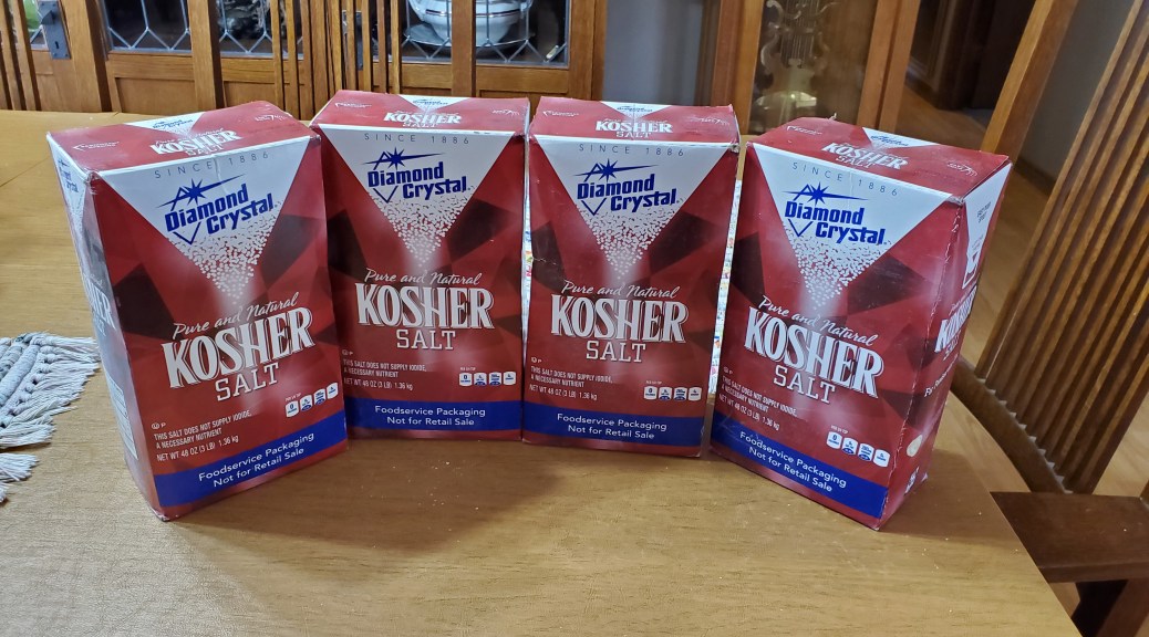 I was home on Monday due to catching Husband’s cold. The Postie came and delivered a package of kosher salt I had ordered from Amazon. If laughter is the best medicine, I should be cured by now.