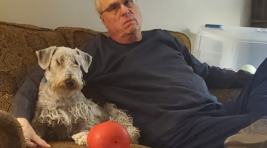 Our Cesky Terrier, Kyrill, is a lovely and affectionate boy who is really spoiled. He has pegged Husband as an easy mark for constant play and cossetting. Kyrill goes up to Husband and sits at his feet and whines. Husband can’t standi it, and finds things for the dog to do, or else gets him a snack of ice cubes. The dog loves ice cubes. The dog knows better than to try it with me. I have to admit, though, that no matter how often I tell Kyrill that I am done tugging with him, I invariably end up tugging with him again. After that I say “Go to Daddy”, and the dog takes his tug over to Husband and they tug. It is nice to have a partner who takes care of me, too, although I think I am taking advantage of Husband’s weaknesses!