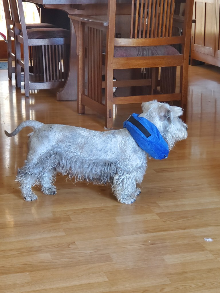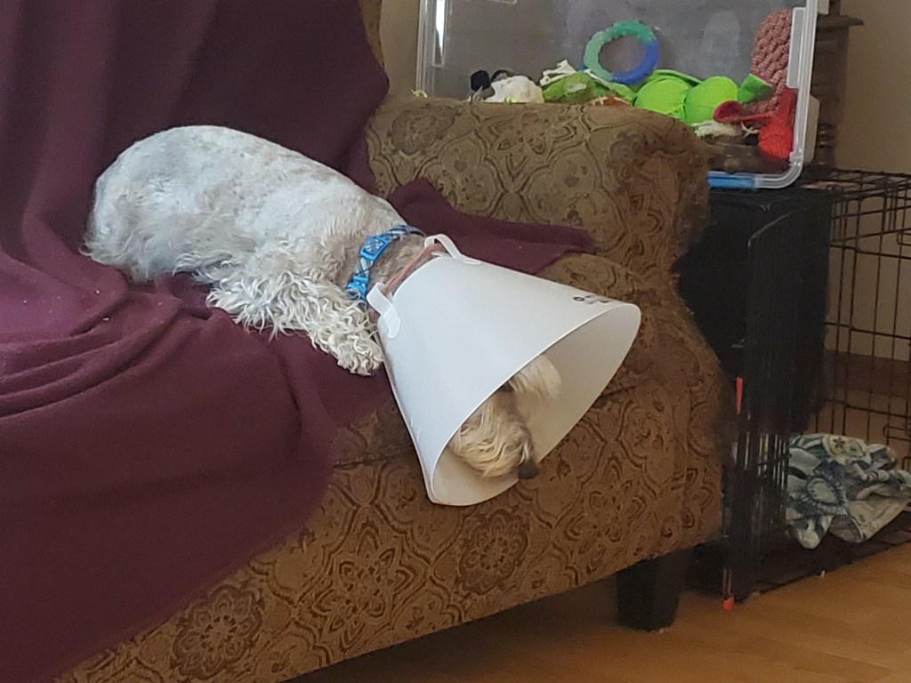 Kyrill hates it. It is made even more awkward by his shape. Kyrill has a long snout, so he needs a good sized cone to keep that long snout away from the incision. His legs are really short, though, so unless he holds his head up high, the cone drags on the floor. The cone also pushes away or obscures things he wants to pick up. This makes eating and drinking difficult.